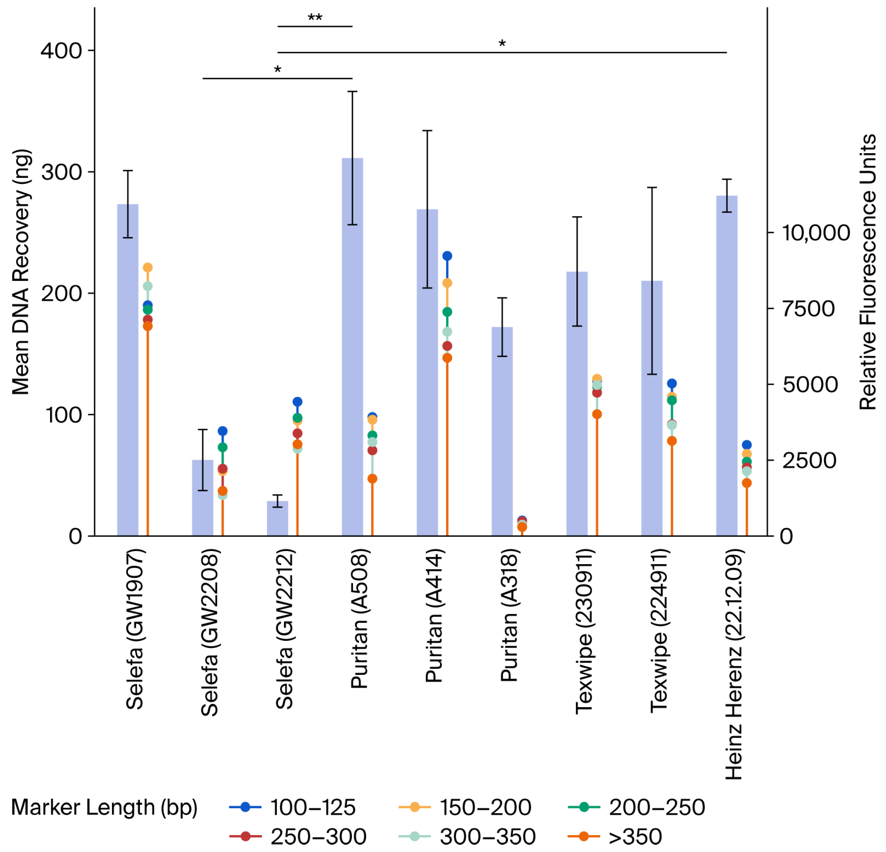 Figure 3. Bar plot (left y-axis) with the total DNA recovery from nine cotton swabs. Lollipop plot (right y-axis) with the RFU values for STR markers grouped after the allele lengths for the nine tested cotton swabs. * p < 0.05, ** p < 0.01.