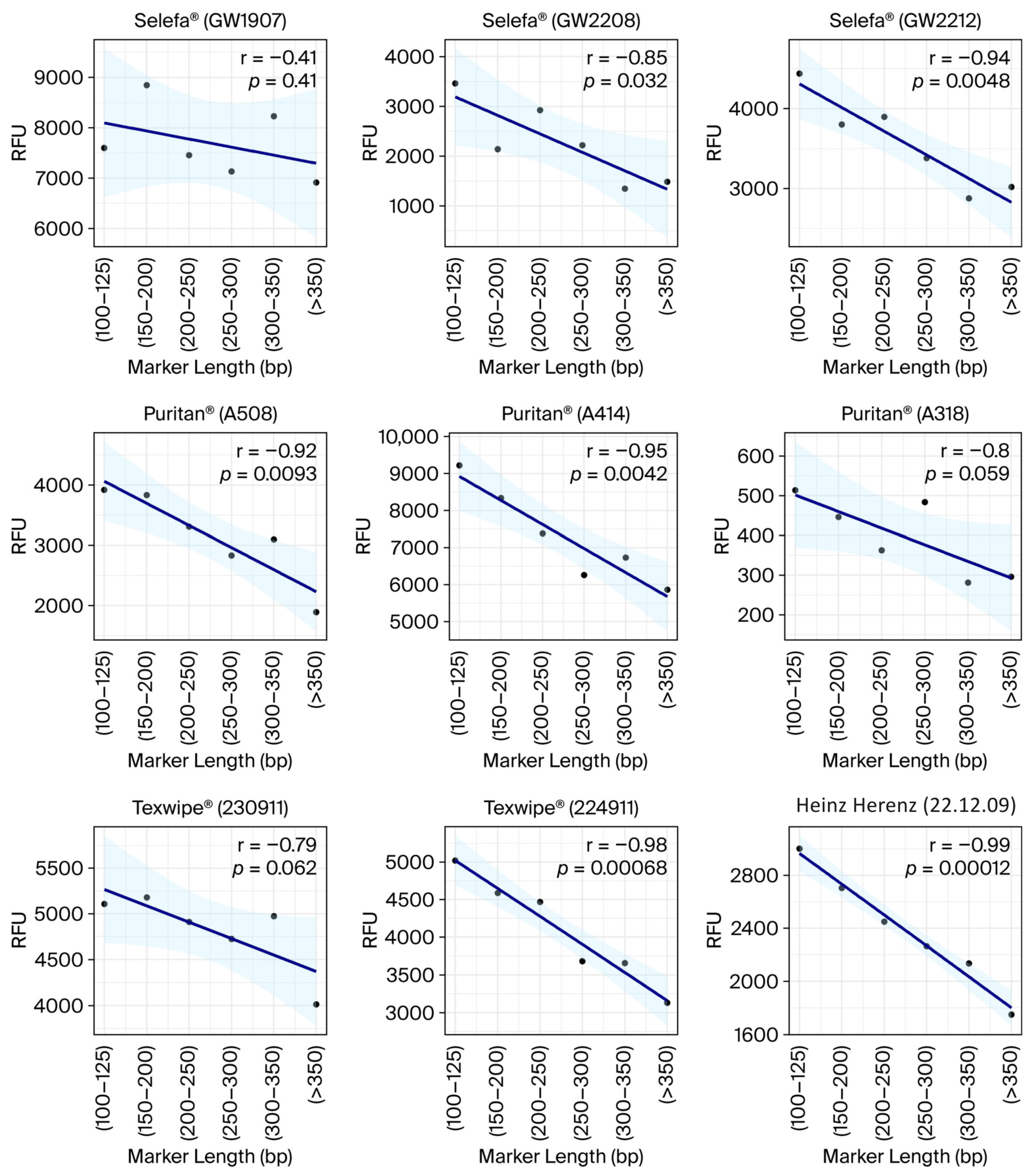 An STR analysis (n = 9) was conducted to evaluate the quality of DNA collected with different swabs, on the biological replicate closest to the median DNA yield for each swab type. A comparison between RFU values and amplicon sizes was performed to assess whether reduced amplification of larger-size loci occurred, which would indicate size-dependent inhibition. In general, there was a negative correlation between RFU values and marker sizes across the tested swabs, with r values ranging from −0.41 to −0.99, indicating a size-dependent reduction in signal (Figure 4; Supplementary S2, Table S9). The RFUs ranged from approximately 500 to 9000 for the shortest markers and 300 to 7000 for the longest markers, with large variation between swabs. The strongest negative correlations were observed for Puritan (AA414), Texwipe (224911), and Heinz Herenz, with r values of −0.95, −0.98, and −0.99, respectively. The Selefa (GW1907) and Puritan (A414) swabs yielded both very high DNA quantities and RFUs, while the Selefa (GW2808) and Selefa (GW2212) swabs yielded notably lower DNA quantities with higher RFUs relative to the concentration (Figure 3 and Figure 4; Supplementary S2, Tables S5 and S7–S9). Moreover, Puritan (A508), Puritan (A318), and Heinz Herenz yielded high DNA quantities and lower RFUs. Interestingly, these swabs yield low RFU signals relative to the DNA recovery, indicating that high DNA quantity is not always correlated with downstream amplification success. A summary of observed degradation, including size-dependent signal loss among the tested swabs, is presented in Supplementary S2, Table S9. The overall findings reveal that DNA recovery varies not only across swab brands but also between different lots of the same brand.