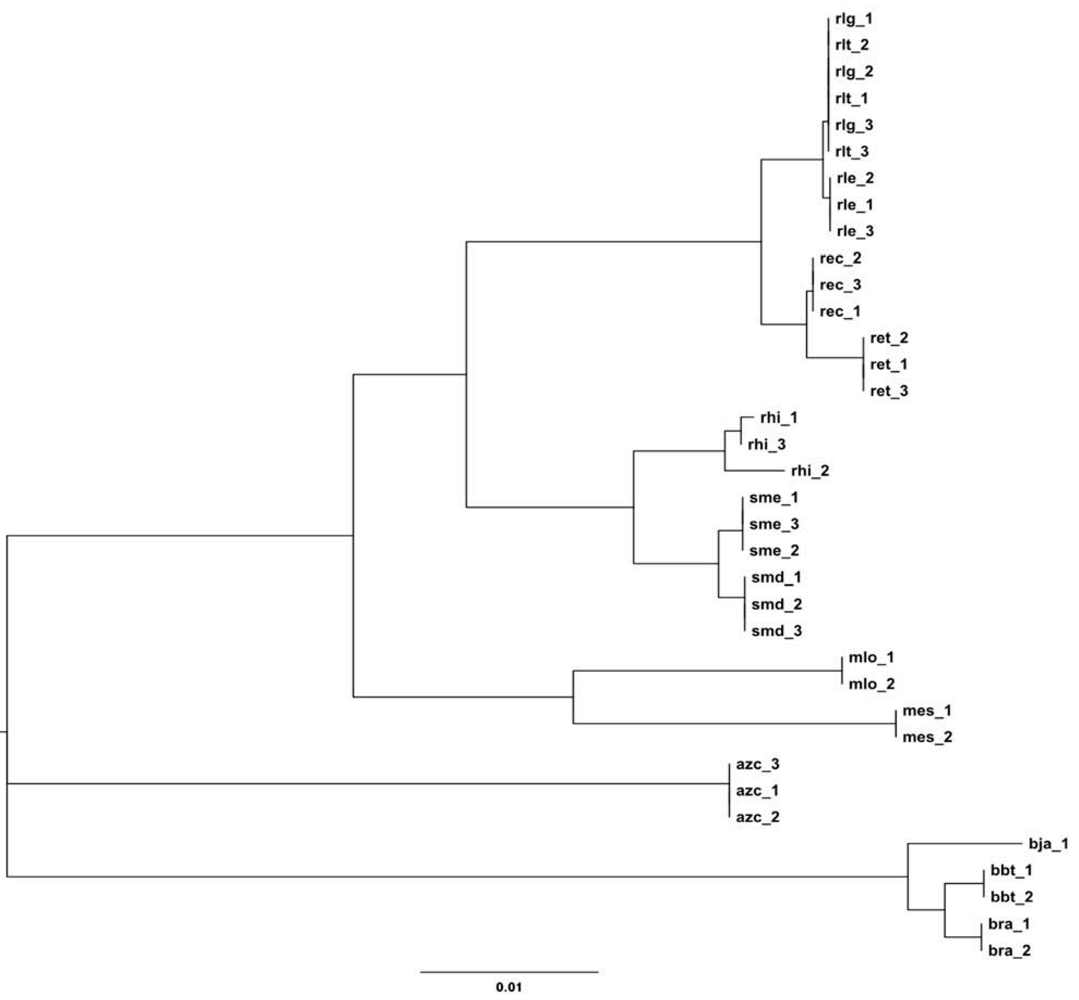 The genus Rhizobium, originally defining all bacterium with the ability to nodulate legumes [14], has undergone multiple redefinitions and now encompasses a variety of fast growing nitrogen fixers including some former Agrobacterium and Sinorhizobium (Ensifer) species and the genus Allorhizobium. In this study, five Rhizobium genomes are investigated: R. etli CFN 42 (ret), R. etli CIAT 652 (rec), R. leguminosarum bv. trifolii WSM1325 (rlg), R. leguminosarum bv. trifolii WSM2304 (rlt) and R. leguminosarum bv. viciae 3841 (rle). These five Rhizobium strains have different origins and hosts. The R. etli strains nodulate common bean (Phaselous vulgaris and were originally isolated in Central America) [15,16,17,18]. In contrast, the R. leguminosarum strains nodulate temperate legumes: bv. trifolii rlg and rlt are symbionts of clovers (Trifolium), although individually matched to annual (rlg) and perennial (rlt) species for N fixation [19,20], Bv. viciae rle has a broader host range, nodulating legumes within the tribe Viciae, including Pisum, Vicia, Lathyrus and Lens [21].