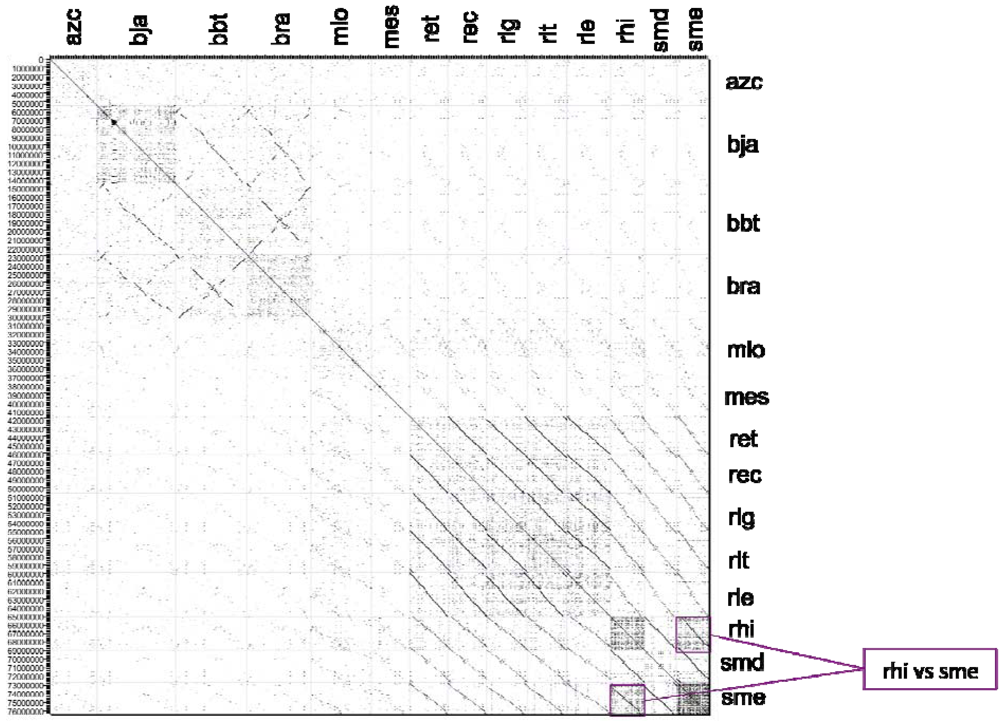 Further comparison of whole chromosomes adds valuable information to the 16S rRNA taxonomy results. A dotplot of the chromosome nucleotide sequences was compiled using an in-house application called FRECKLE (Figure 2) (http://code.google.com/p/freckle/). Two primary blocks of significant sequence similarity are those of the Bradyrhizobium species with another larger block consisting of the Rhizobium and Sinorhizobium strains, while Azorhizobium and Mesorhizobium are outliers. The sme chromosome shows a highly repetitive structure, more than any other chromosome. Interestingly, the dotplot also displayed a strong sequence similarity between Sinorhizobium NGR 234 and S. meliloti 1021, including a shared repetitive structure.