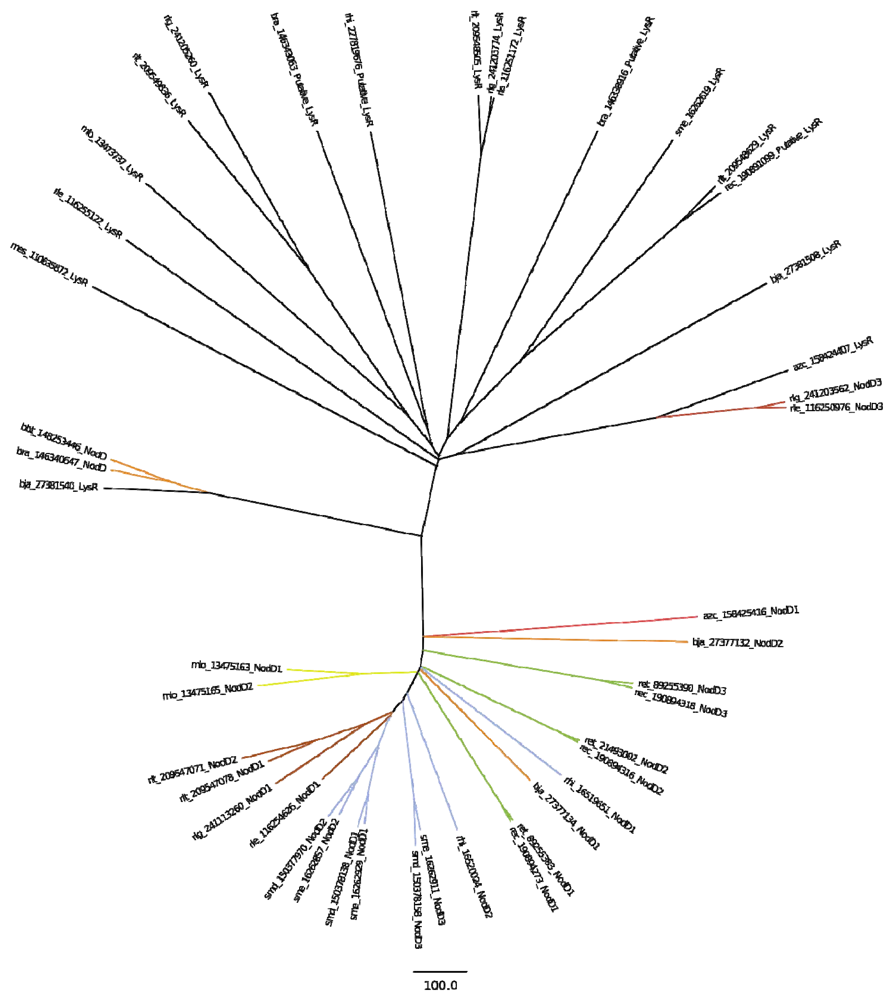 - Vlassak, K.M.; de Wilde, P.; Snoeck, C.; Luyten, E.; van Rhijn, P.; Vanderleyden, J. The Rhizobium sp. BR816 nodD3 gene is regulated by a transcriptional regulator of the AraC/XylS family. Mol. Gen. Genet. 1998, 258, 558–561. [Google Scholar] [CrossRef]