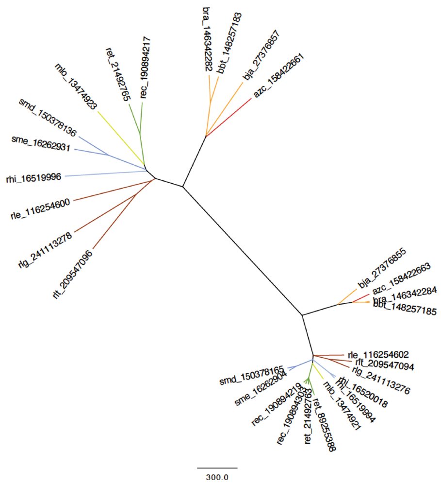 Mesorhizobium sp. BNC1 (mes), formerly known as Agrobacterium sp. BNC1, and alternately named Chelativorans sp. BNC1, is the functional outlier of the fourteen species, being asymbiotic. It was isolated from a mixed-culture enriched from sewage using the chelating agent EDTA as the sole carbon and nitrogen source [13]. For this study, mes is utilized as an outlier for the basis of “symbiome” definition and investigation.