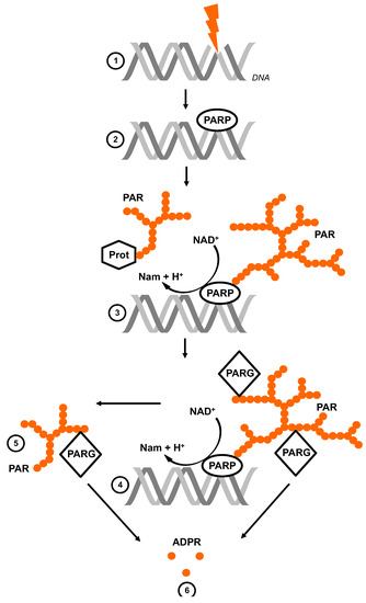 Poly(ADP-ribosyl)-ation belongs to the nonprotein posttranslational modifications and is a metabolite of the enzymatic cofactor nicotinamide adenine dinucleotide (NAD+). Poly (ADP-ribose) polymerases (PARPs) cleave the nicotinic moiety from NAD+ and convert the ADP-ribose (ADPR) units into long APD-ribose polymers (PAR). At the protein level, the β-α-loop-β-α NAD+ fold is the most conserved region in PARPs and is therefore termed the PARP signature motif [1,2,3]. To date, 17 distinct PARP enzymes have been discovered and numbered accordingly. Recently a new nomenclature has been suggested that is based on their transferase activity (ARTD nomenclature [4]): PARP1 (ARTD1), PARP2 (ARTD2), PARP3 (ARTD3), PARP4 (ARTD4, vault-PARP), PARP5A (ARTD5, Tankyrase 1), PARP5B (ARTD6, Tankyrase 2), PARP6 (ARTD17), PARP7 (ARTD14, TIPARP, RM1), PARP8 (ARTD16), PARP9 (ARTD9, BAL1), PARP10 (ARTD10), PARP11 (ARTD11), PARP12 (ARTD12, ZH3HDC1), PARP13 (ARTD13, ZC3HAV1, ZAP1), PARP14 (ARTD8, BAL2 COAST6), PARP15 (ARTD7, BAL3), and PARP16 (ARTD15). However, not all PARP enzymes are proven poly(ADP-ribose) polymerases. Several of them seem to belong to the class of mono(ADP-ribosyl) transferases [5]. The nuclear PARP1 and PARP2 are the best characterized PARPs in mammals and are true poly(ADP-ribose) polymerases. PARP1 has a modular structure and starts its catalytic activity after binding to DNA nicks and breaks with the double zinc finger domain [2]. Recently, a third zinc finger-like structure was discovered. It is required for transmitting DNA-induced conformational changes to the catalytic domain [6,7]. The C-terminal catalytic domain sequentially transfers ADPR units from NAD+ to protein acceptors generating PAR. Third, in the automodification domain, specific glutamatic acid and lysine residues serve as acceptors of ADPR allowing the enzyme to poly(ADP-ribosyl)ate itself. While the level of PAR is very low under physiological condition, it rises 200-fold under genotoxic stress conditions. After DNA damage, PARP1 is rapidly recruited and its catalytic activity increases 10- to 500-fold to synthesize long and branched PAR chains (Figure 1) [3,8]. PARP1 is the main enzyme generating PAR and it is the main acceptor for covalent PAR modification. More than 90% of PAR originates from PARP1 during genotoxic stress [8,9]. PARP‑bound PAR can recruit many other proteins involved in distinct cellular functions, including enzymes involved in DNA repair [10,11,12,13,14,15,16]. The system of PAR accepting and/or interacting proteins is very complex and not completely understood. Moreover, novel proteome-wide analyses allow the identification of putative PAR binding proteins [10]. Automodification of PARP1 diminishes the affinity of the enzyme for DNA breaks. This provides a mechanism for removing PARP1 from damaged DNA and for local modulation of chromatin compaction and transcriptional regulation [11,17,18,19].