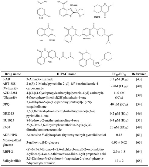Within the last few decades, the concept of interfering with proteins involved in DNA repair and stress signaling has attracted a lot of attention in both basic and clinical research. To date, chemical inhibitors against PARP enzymes have reached the first level of clinical application. Almost all PARP inhibitors in preclinical and clinical studies compete with the substrate NAD+ for the catalytic domain leading to a reversible inhibition of enzyme activity. The third generation PARP inhibitors veliparib (ABT-888) and olaparib (AZD2281/KU-0059436) are the most clinically investigated, and their half-maximal inhibitory concentration (EC50 or Ki) is in the nanomolar range for PARP1 and PARP2 (Figure 2) [39,40]. Both inhibitors are sufficiently bioavailable when administered orally and they are primarily used as anticancer drugs alone or in combination with other treatments (discussed in [41]). Moreover, the potential of PARP inhibitors to participate in the concept of synthetic lethality is under investigation [41,42].