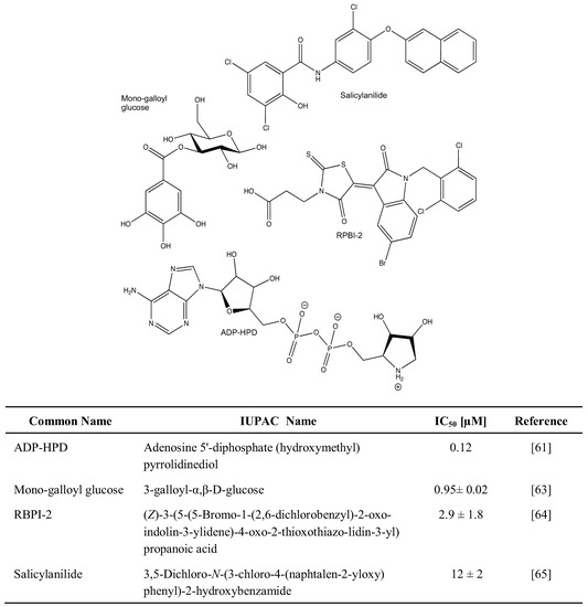 Much less is known about the inhibitors of PARG, as was recently reviewed [60]. Whereas a number of natural and synthetic molecules have been described to exhibit PARG-suppressing activity, most of them are restricted in terms of bioavailability and/or specificity. Nevertheless, the use of Adenosine 5'-diphosphate (hydroxymethyl) pyrrolidinediol (ADP-HPD) [61,62], 3-Galloyl-α,β-D-glucose [63], (Z)-3-(5-(5-Bromo-1-(2,6-dichlorobenzyl)-2-oxoindolin-3-ylidene)-4-oxo-2-thioxo-thiazolidin-3-yl) propanoic acid [64], and 3,5-Dichloro-N-(3-chloro-4-(naphtalen-2-yloxy)phenyl)-2-hydroxy benzamide [65] may inhibit PARG specifically and help understand its role within a wider biological context (Figure 3).