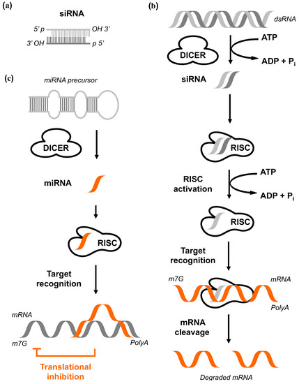 The pathway of RNA interference. (a) Highly specific siRNA which are 21–23nt double-stranded RNA (dsRNA) duplexes in size with symmetric 2-3 nucleotide 3’ overhangs and 5’ phosphate (P) and 3’ hydroxyl (OH) groups. (b) The dsRNA is cleaved by Dicer in an ATP-dependent reaction. The siRNAs are subsequently incorporated into a multicomponent RNA-inducing silencing complex (RISC). Activated RISC unwinds the siRNA in an ATP-dependent fashion. The resulting antisense strand guides the RISC to its complementary mRNA before endonucleolytic cleavage of target mRNA. The free ends of the mRNA fragments are rapidly degraded by cytoplasmic nucleases. This ultimately results in the loss of protein expression. (c) Dicer cleaves the miRNA precursor to produce 22 nt miRNA. The single-stranded miRNAs are incorporated into RISC, followed by target recognition and final translational inhibition [104].