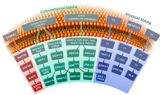 - Cargnello, M.; Roux, P.P. Activation and function of the MAPKs and their substrates, the MAPK-activated protein kinases. Microbiol. Mol. Biol. Rev. 2011, 75, 50–83. [Google Scholar] [CrossRef]