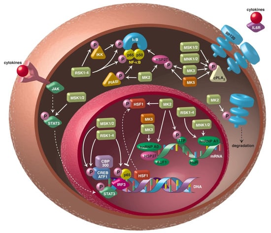- Gaestel, M.; Kotlyarov, A.; Kracht, M. Targeting innate immunity protein kinase signaling in inflammation. Nat. Rev. Drug Discov. 2009, 8, 480–499. [Google Scholar] [CrossRef]