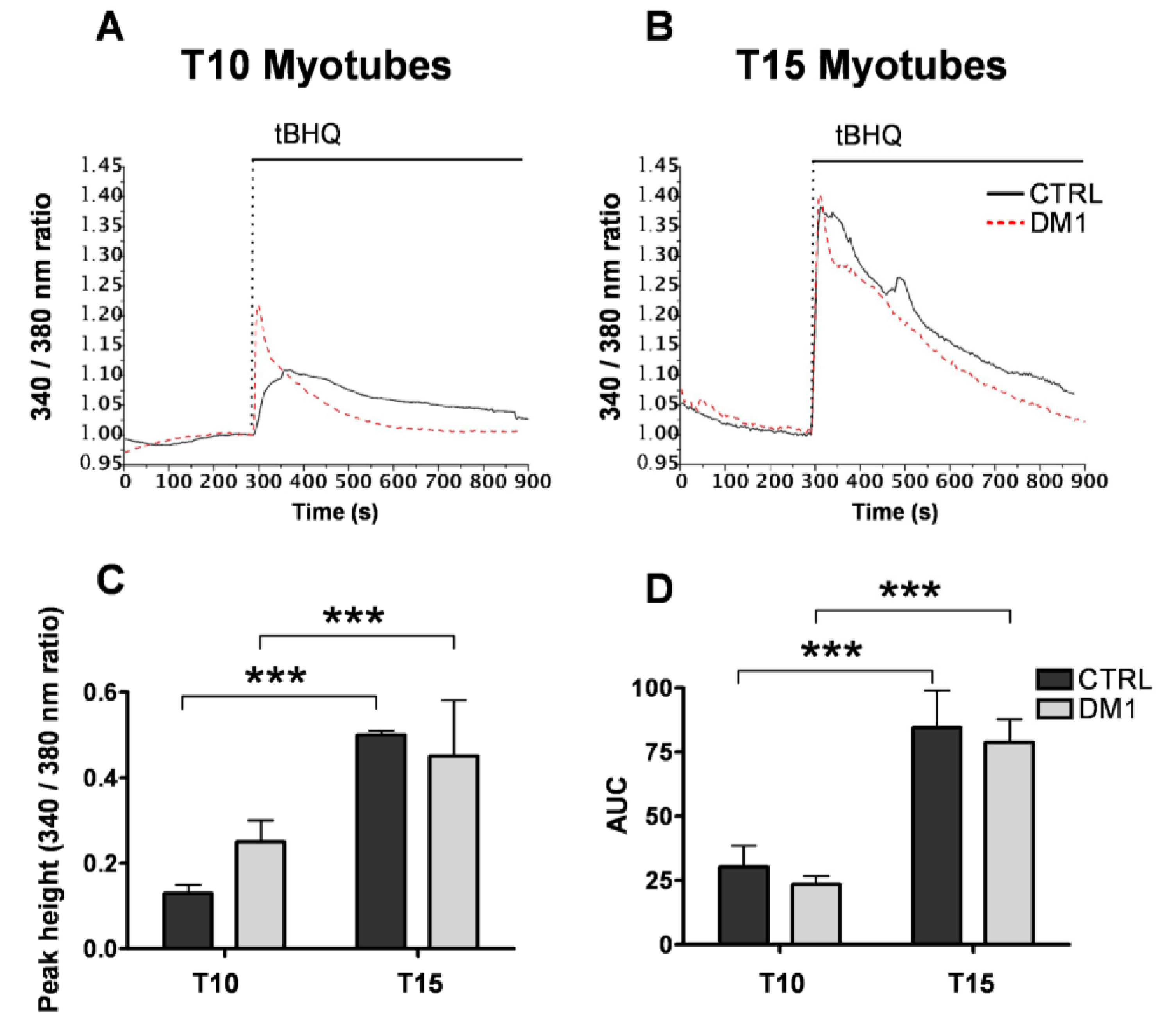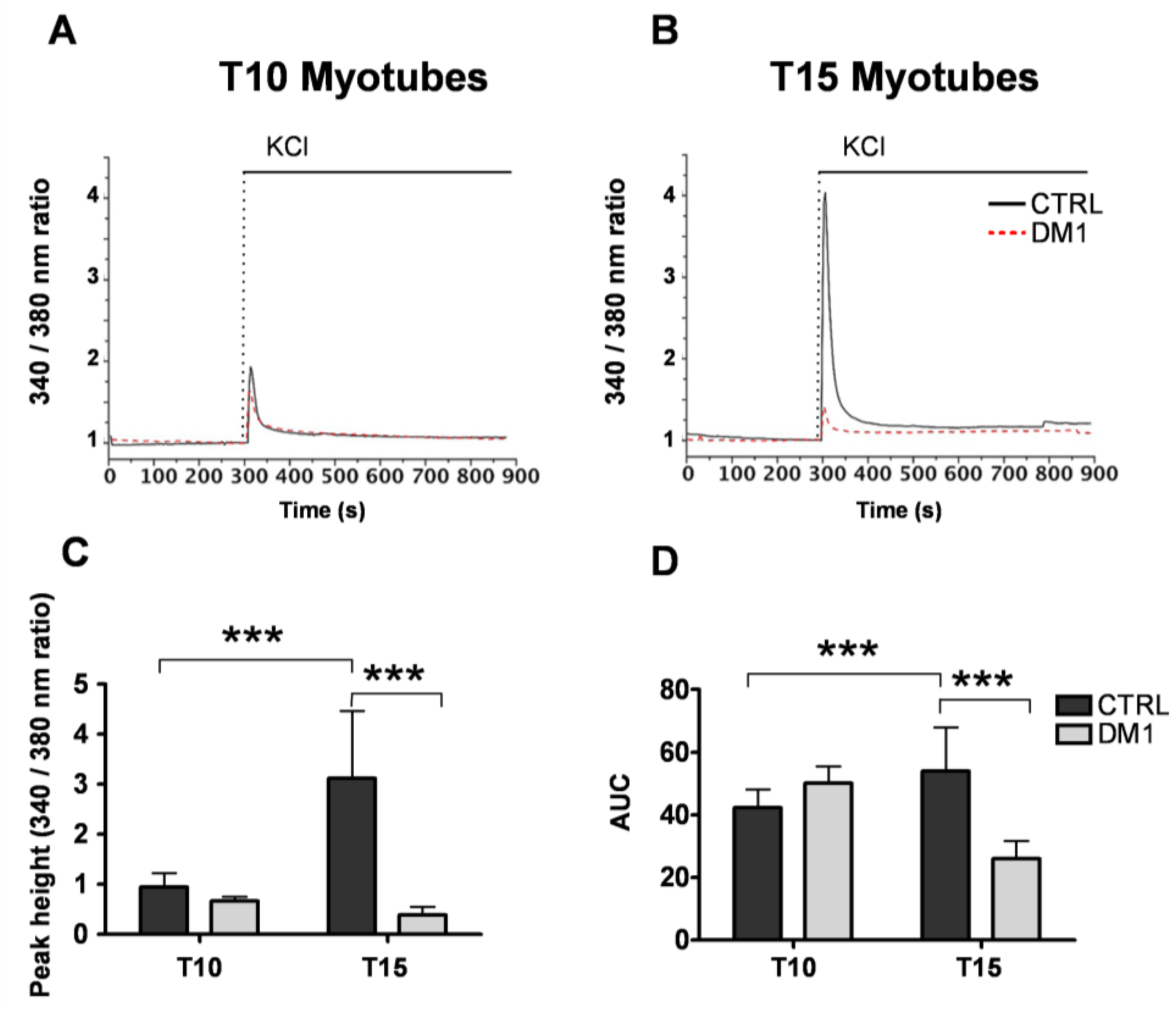 Depolarization induced cytosolic Ca2+ responses in control and Myotonic Dystrophy type 1 (DM1) myotubes at sequential stages of differentiation. Depolarization was induced by the addition of 120 mM KCl to the myotubes at 10 days (T10, A) and 15 days (T15, B) of differentiation. [Ca2+] was assessed by measuring fura-2 ratios at 340 nm and 380 nm excitation as described in the Methods section. Representative traces of n > 6 experiments are shown. (C) Quantification of the Ca2+ peak responses induced by KCl in control and DM1 myotubes. (D) Quantification of the area under the curves (AUC). Data represent mean ± SD. *** p < 0.001 as compared to controls by Students’ t test.