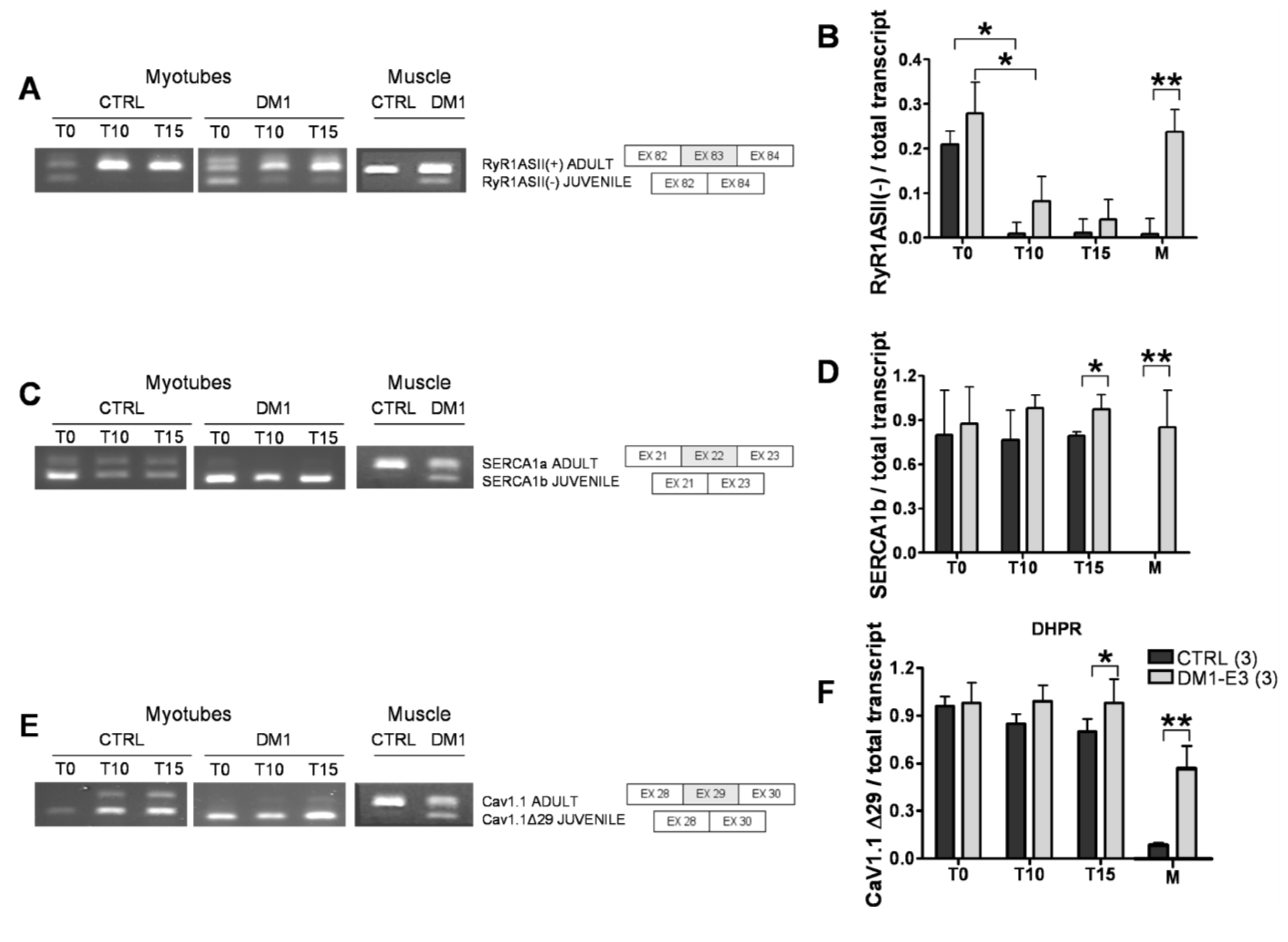 DM1 is also associated with misregulated alternative splicing of CACNAIS, the gene encoding Cav1.1 [19]. Skipping of exon 29 deletes a 19-amino acid fragment and determines the juvenile form of Cav1.1. We assessed the regulation of Cav1.1 splicing in primary muscle culture and found a progressive increase of ex29 inclusion in Cav1.1 protein of T10 and T15 control myotubes. On the contrary, we found a near-complete skipping of ex29 in DM1 T10 and T15 myotubes which was significantly different from controls at T15 ( p < 0.05) (Figure 3E,F).