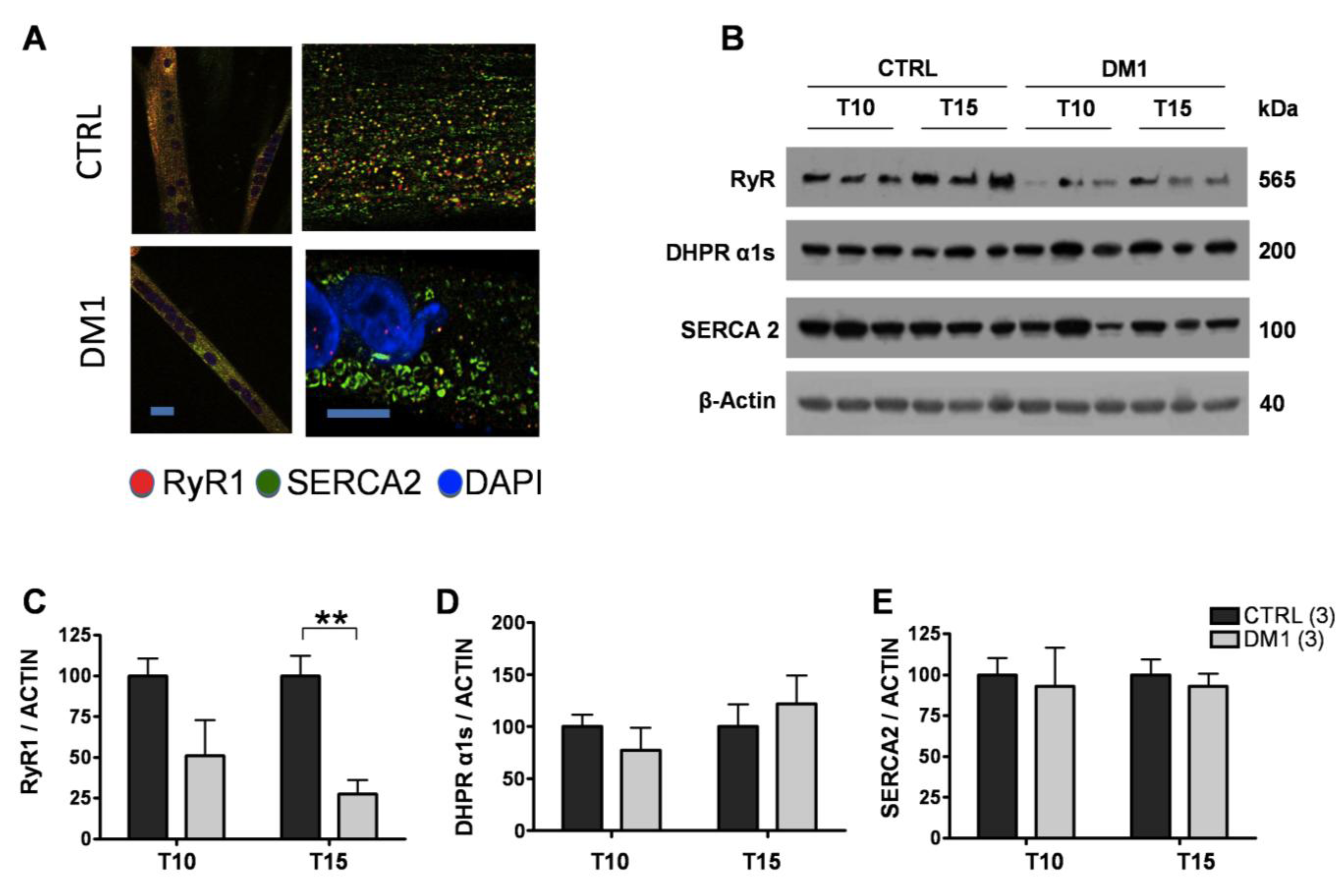 Expression of Ca2+ channels and transporters in control and DM1 myotubes at 10 (T10) and 15 (T15) days of differentiation. (A) Representative images of SERCA2 (green) and RyR1 (red), nuclei (blue-Dapi) immunofluorescence of T15 differentiated control and DM1 myotubes. Scale bar is 10 μm. (B) Representative Western blot analysis of RyR1, DHPR α1s (Cav1.1) and SERCA2 of control and DM1 myotubes at 10 and 15 days of differentiation. (C–E) Quantification of RyR1, DHPRα1s and SERCA2 protein levels normalized to β-actin. Data are the mean ± SD of two experiments. ** p < 0.01 as compared to controls by Students’ t test. The numbers of single lines studied is given in brackets.