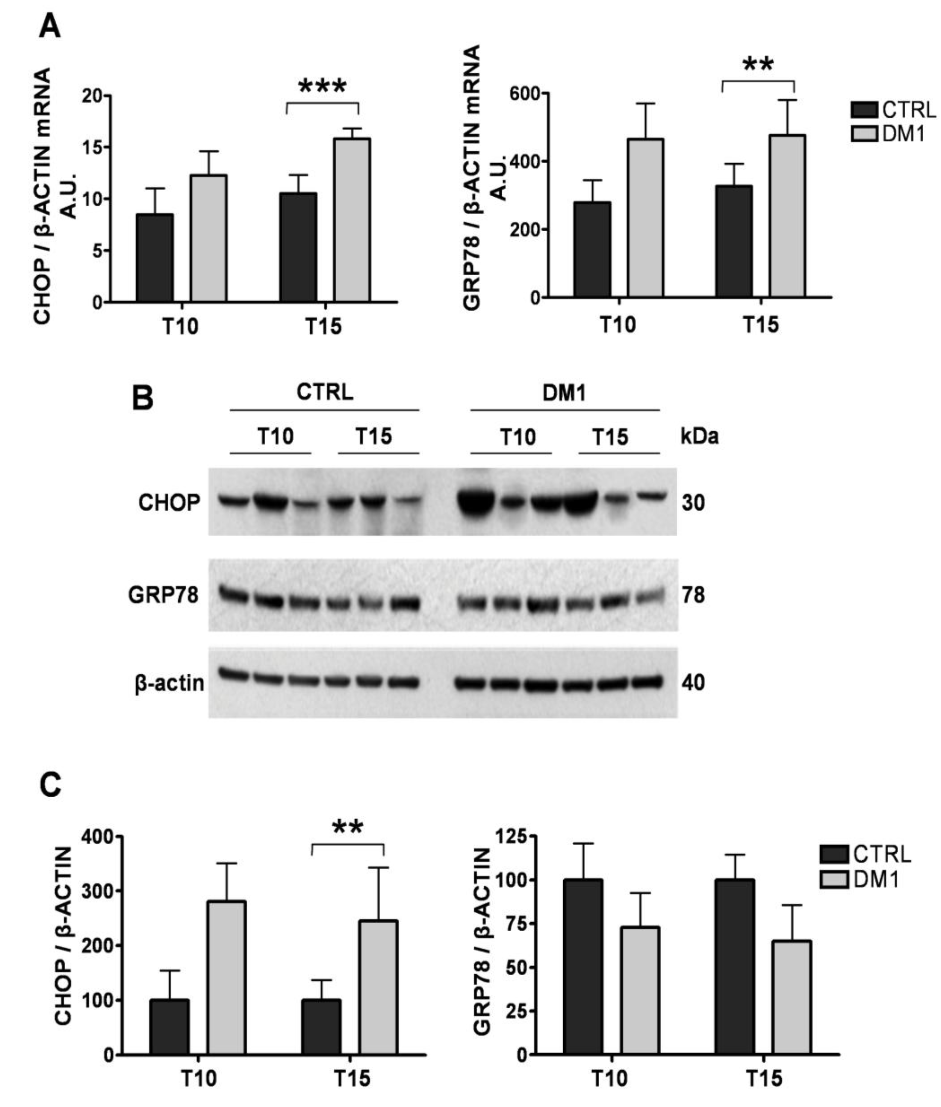 Characterization of the ER stress response in control and DM1 myotubes at 10 (T10) and 15 (T15) days of differentiation. (A) Expression levels of CHOP and GRP78 mRNA of control and DM1 myotubes at 10 and 15 days of differentiation as measured by quantitative RT-PCR. (B) Representative Western blot of CHOP and GRP78 from control and DM1 myotubes at 10 and 15 days of differentiation. (C) Quantification of CHOP and GRP78 protein levels, normalized to β-actin. The values represent the ratio of band intensities and are given in arbitrary units (A.U.) Data are expressed as mean ± SD of a single experiment of RT-PCR carried out in triplicate (A) and as mean ± ES of two experiments for WB (C). * p < 0.05, *** p < 0.001 as compared to controls by Students’ t test.