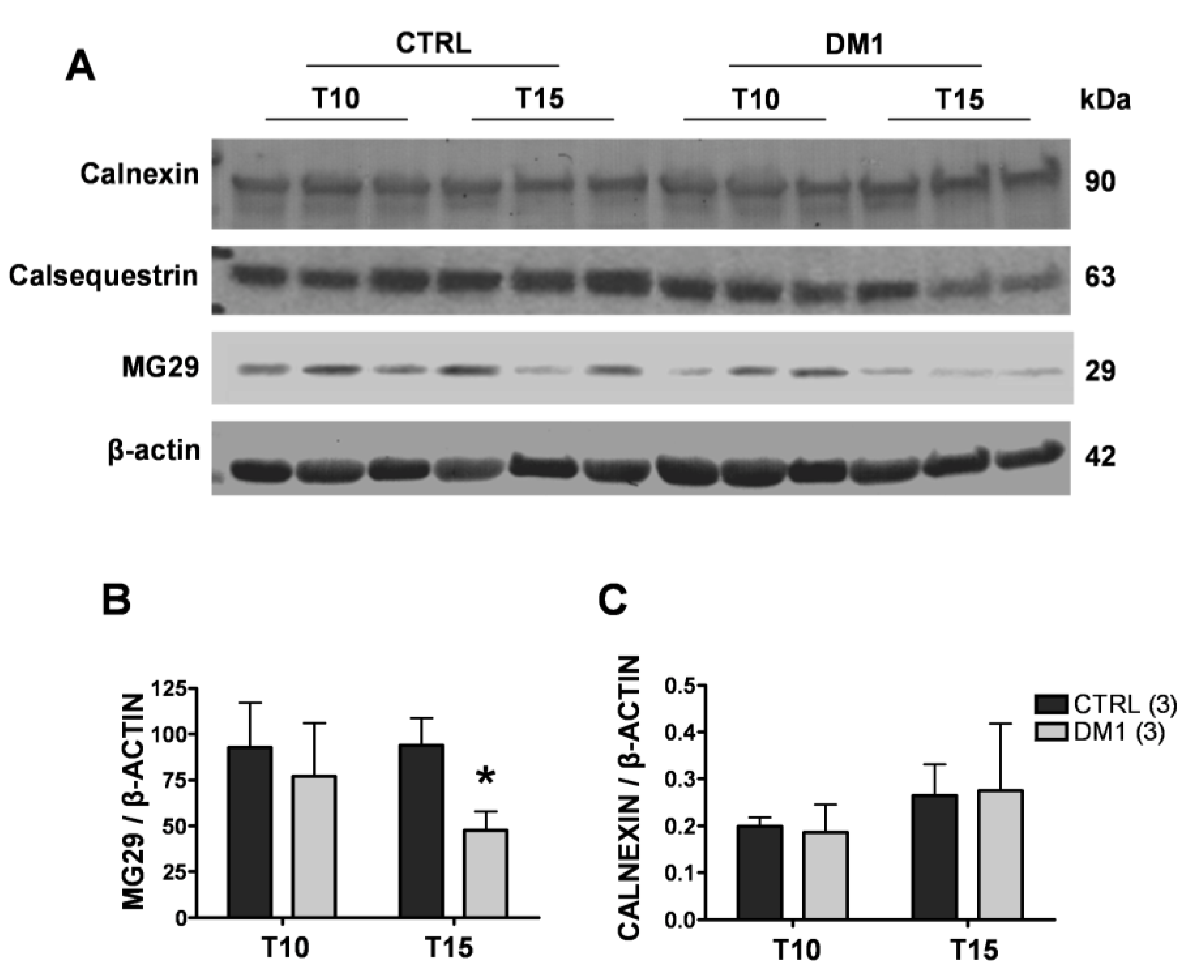 First, we quantified the mRNA of glucose regulated stress protein 78 (grp78) and C/EBP homologous protein (CHOP) by quantitative RT-PCR. As shown in Figure 5A, mRNA levels of the two proteins increased in DM1 myotubes after 10 days of differentiation, which became statistically significant at T15 for both grp78 (47%, p < 0.05) and CHOP (50%, p < 0.001) as compared to controls. Western blot analysis showed that CHOP levels were increased about twofold in DM1 myotubes as compared to controls at both T10 and T15 (Figure 5B,C), while no changes were observed in grp78 levels, probably indicating increased turnover of the protein (Figure 5B,C). In order to investigate the extent of deregulation of ER/SR protein homeostasis, we also examined the levels of major proteins involved in maintaining ER/SR structure and Ca2+ levels. While the levels of Ca2+ binding proteins calsequestrin and calnexin remained unchanged (Figure 6A,C), we found significantly decreased levels of MG29 in T15 DM1 myotubes, a protein implicated in the maintenance of triad junctions (Figure 6A,B).