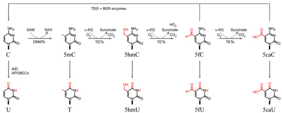 (Top) Cytosine methylation and demethylation pathways; (Bottom) Products of cytosine and C5-substituted cytosine deamination.