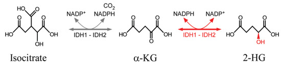 Conversion of isocitrate to α-ketoglutarate (α-KG) by isocitrate dehydrogenases (IDH) enzymes and conversion of α-KG to d-2-hydroxyglutarate (2-HG) by gain-of-function mutations in IDH1 or IDH2.
