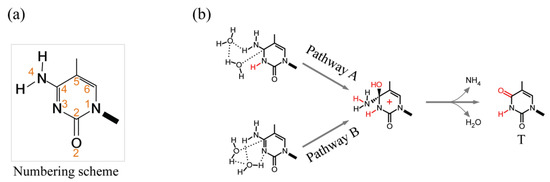 (a) Numbering scheme for cytosines; (b) Pathways for the spontaneous deamination of C and 5mC (only 5mC is shown).
