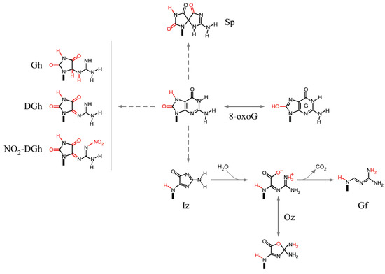 - Cui, L.; Ye, W.; Prestwich, E.G.; Wishnok, J.S.; Taghizadeh, K.; Dedon, P.C.; Tannenbaum, S.R. Comparative analysis of four oxidized guanine lesions from reactions of DNA with peroxynitrite, singlet oxygen, and gamma-radiation. Chem. Res. Toxicol. 2013, 26, 195–202. [Google Scholar] [CrossRef]