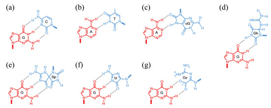 - Suzuki, M.; Kino, K.; Morikawa, M.; Kobayashi, T.; Komori, R.; Miyazawa, H. Calculation of the stabilization energies of oxidatively damaged guanine base pairs with guanine. Molecules 2012, 17, 6705–6715. [Google Scholar] [CrossRef]