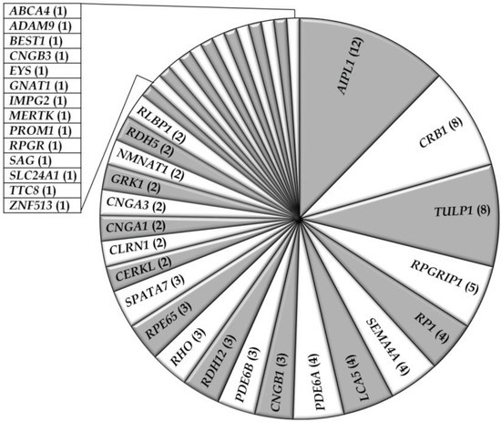 Thus far, fifty-six studies have reported on the genetic causes of non-syndromic RD including arCRD, arCSNB, arLCA, and arRP in Pakistani persons, most of which belong to consanguineous families. The genetic data of a total of 466 Pakistani RD patients from 103 families (Table 1 and Table 2), have been described in the current review. Among these retinal phenotypes, arRP was found to be the most frequently occurring RD (59%), followed by arLCA (19%), arCRD (10%), and arCSNB (9%) (Table 1 and Table 2; Figure 1). Autosomal recessive inheritance seems to predominate in the RD families (96%) and only two autosomal dominant RP (adRP) families have been described (Table 1 and Table 2). Of these, one adRP family carries a mutation in RHO (MIM# 180380) [26], while in one family a frequent variant (c.2138G>A) in SEMA4A (MIM# 607292) has been described to cause adRP, however in silico prediction and exome variant server (EVS) frequency do not support the pathogenicity of the latter variant (Table 2) [27]. The compiled data demonstrate that out of the 132 genes known to be involved in non-syndromic RD, mutations in 36 different genes are causing disease in patients of Pakistani origin (Table 1; Figure 2), reflecting the genetic heterogeneity of the disease in this population. The most frequently mutated genes were AIPL1 (MIM# 604392), CRB1 (MIM# 604210), TULP1 (MIM# 602280), RPGRIP1 (MIM# 605446), RP1 (MIM# 180100), SEMA4A, LCA5 (MIM# 611408), and PDE6A (MIM# 180071) (Figure 2). Most of the reported mutations, and those identified in the current cohort, were novel to this population except for mutations in ABCA4 (MIM# 601691), CRB1, CERKL (MIM# 608381), RPE65 (MIM# 180069), RPGR (MIM# 312610), and SPATA7 (MIM# 609868), which were initially identified in persons of different ethnicity (Table 1). As expected, all the reported disease associated alleles are rare variants and in silico analysis predicted these variants to have a deleterious effect on protein function (Table S1).
