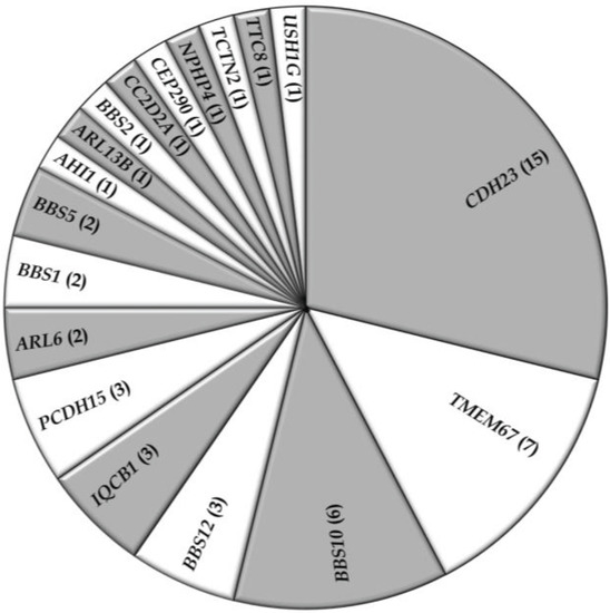 - Chen, J.; Smaoui, N.; Hammer, M.B.; Jiao, X.; Riazuddin, S.A.; Harper, S.; Katsanis, N.; Riazuddin, S.; Chaabouni, H.; Berson, E.L.; et al. Molecular analysis of Bardet-Biedl syndrome families: Report of 21 novel mutations in 10 genes. Invest. Ophthalmol. Vis. Sci. 2011, 52, 5317–5324. [Google Scholar] [CrossRef]