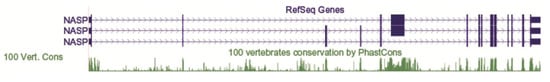 The intron-exon structure of a typical human gene displayed on the UCSC genome browser []. Introns are shown as lines (the “arrowheads” in the lines indicate the direction of transcription). Exons are shown as vertical bars. Coding exons are shown as thicker vertical bars than non-coding exon sequence. This example shows the NASP gene. The gene structures shown are “Refseq genes” that represent known human protein-coding and non-protein-coding genes taken from the NCBI RNA reference sequences collection. Notice that this single gene locus contains three distinct Refseq annotations containing different exon structures. Conserved sequences detected by comparative genomic information from 100 vertebrate genome sequences are shown at the bottom as a Phastcons plot—the higher values are most conserved, and often correspond to exons.