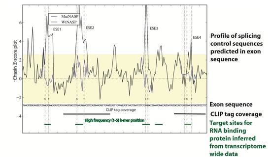 The availability of genome sequences have allowed system-wide approaches to identify splicing enhancers and silencers that control splicing and led to significant insights into the “splicing code” []. These approaches have included machine learning approaches to utilize hundreds of features in pre-mRNAs including motifs bound by RNA binding proteins and RNA secondary structure predictions to predict in vivo splicing decisions []. Computer programmes have also been devised that can computationally predict positions of predicted splicing enhancers and silencers and the target sequences of RNA binding proteins in an input genomic sequence (e.g., Figure 3) [,,,]. The combination of these system-wide experimental and bioinformatic analyses show the splicing code is maintained as nucleotide information in the genome. The splicing code has similar importance to the genetic code that is deciphered to read amino acid sequences from mRNAs. However, the splicing code is much more complex than the genetic code. While the genetic code uses triplet codons to specify amino acids, in the splicing code multiple sequence elements act in combination to decipher the exon/intron structure of pre-mRNAs [].