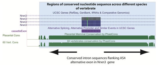 Alternative splicing patterns can also evolve rapidly and sometimes differ between closely related species. For example, despite almost 99% identity in protein coding information, comparative transcriptome analyses have shown that 6%–8% of alternative spliced exons have different inclusion patterns between humans and chimps. These observations are consistent with alternative splicing contributing to species-species differences, and transcriptomes being more distinct between species than protein coding information []. Although the major conclusion from evolutionary comparisons is that much alternative splicing is not conserved between species, comparative genomics show some alternative exons have been highly conserved during evolution [,,]. These include the highly conserved “AS4” alternative exon in the Neurexin3 gene (abbreviated Nrxn3, Figure 4) that is conserved across the vertebrate lineage []. The Neurexin genes have been linked with autism and schizophrenia, and mice genetically engineered to be unable to regulate this AS4 alternative exon in the Nrxn3 gene have different synaptic activity in the brain [].