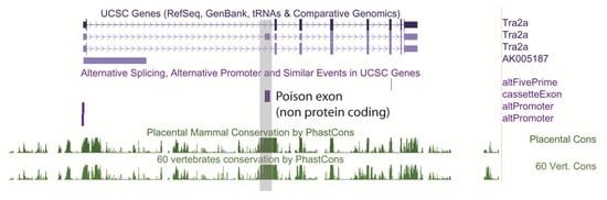 - Grellscheid, S.; Dalgliesh, C.; Storbeck, M.; Best, A.; Liu, Y.; Jakubik, M.; Mende, Y.; Ehrmann, I.; Curk, T.; Rossbach, K.; et al. Identification of evolutionarily conserved exons as regulated targets for the splicing activator tra2beta in development. PLoS Genet. 2011, 7, e1002390. [Google Scholar] [CrossRef]