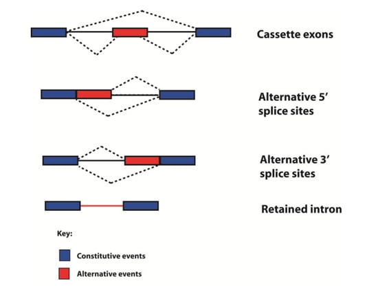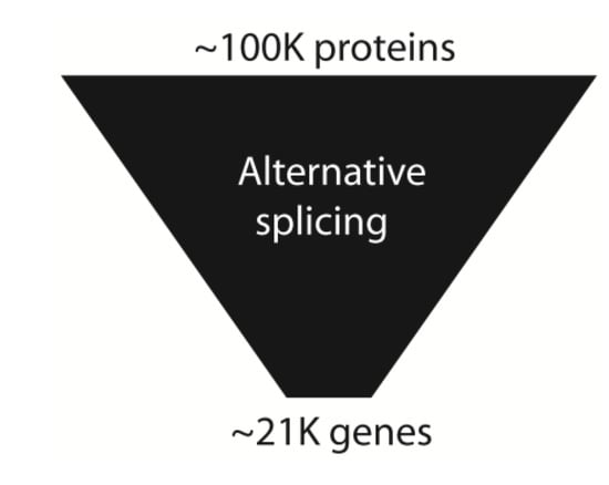 - Maniatis, T.; Tasic, B. Alternative pre-mRNA splicing and proteome expansion in metazoans. Nature 2002, 418, 236–243. [Google Scholar] [CrossRef]