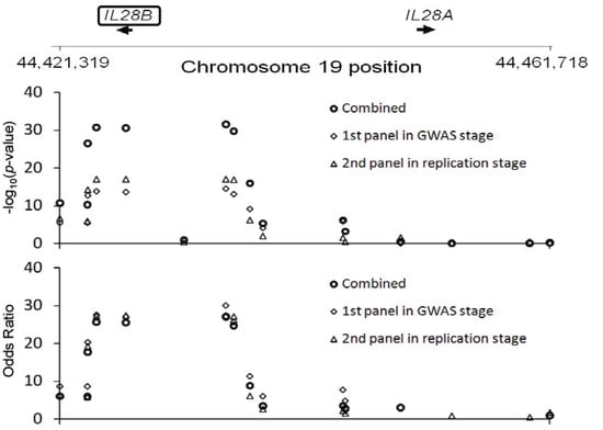 A genome-wide association study (GWAS) on the response to the combined therapy of PEGylated interferon-alpha and ribavirin for chronic hepatitis C identified two SNPs on Chromosome 19 [].