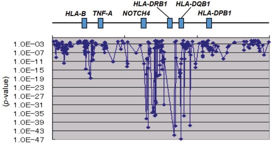With regard to narcolepsy, Juji et al. [] first reported in 1984 an extremely strong association with HLA-DR2 (HLA-DRB1*1501-DQB1*0602 haplotype according to the recent sequence-level nomenclature). We also found an extremely strong association between narcolepsy and the HLA-DR/DQ region with an SNP-based GWAS (Figure 3) []. If the results of HLA analysis in European and African populations are considered together, the primary susceptibility allele is assumed to be HLA-DQB1*0602.