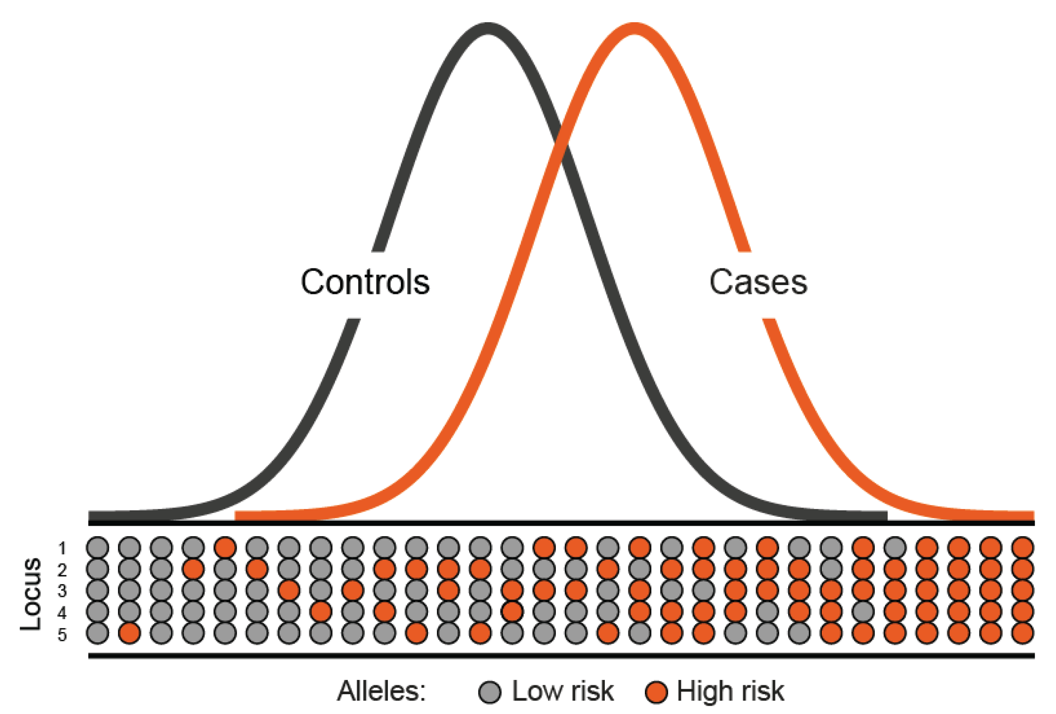 Polygenic model of disease susceptibility. The distribution of risk alleles in both cases and controls follows a normal distribution. However, cases have a shift towards a higher number of high risk alleles.