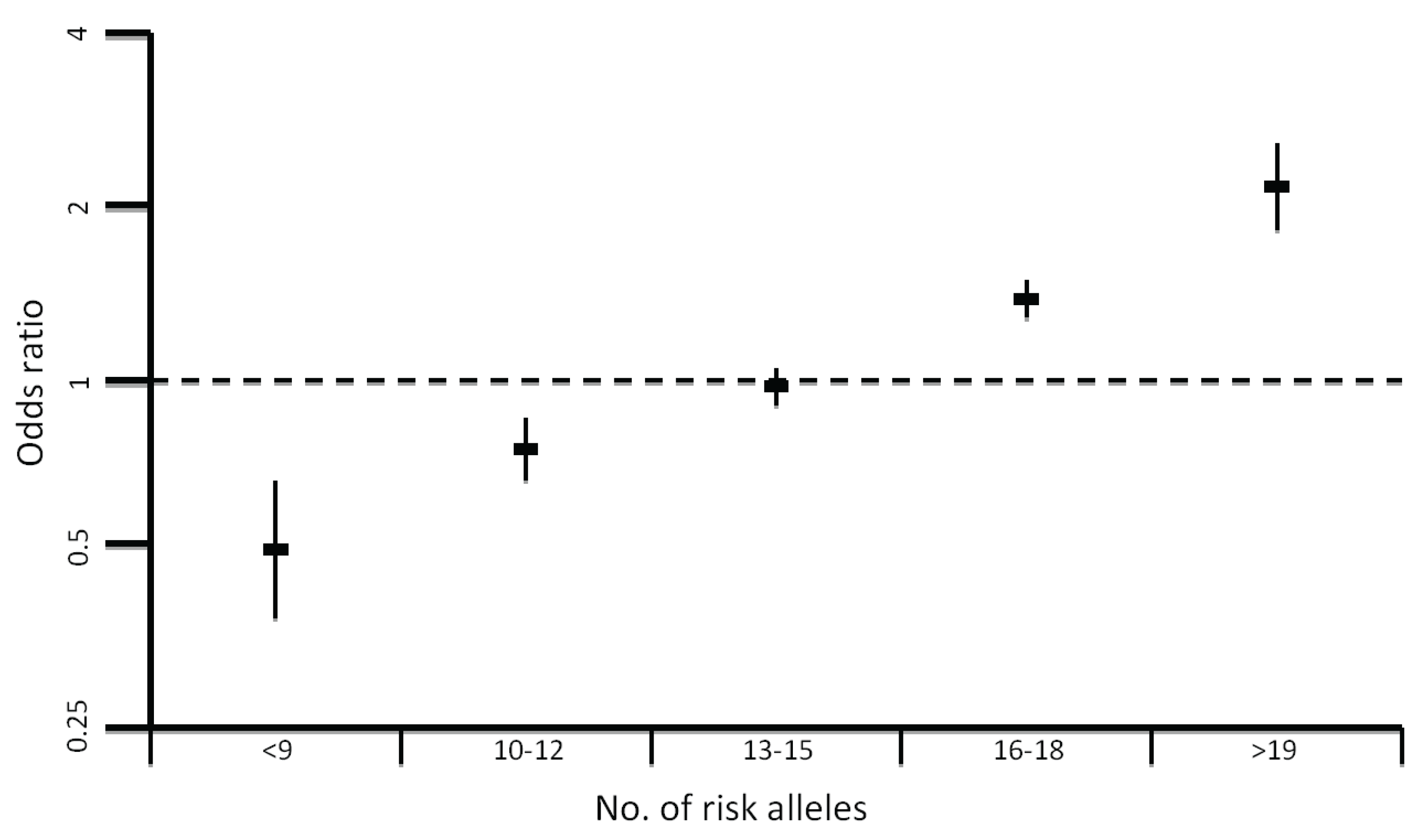Plot showing the increase in odds ratio for colorectal cancer with an increasing number of risk alleles.