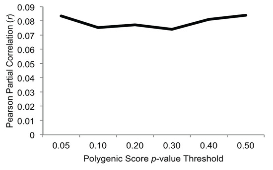 There are no set criteria for creating maximally informative polygenic scores [39], and so we created a series of scores using p-value thresholds ranging from 0.05 to 0.50. Table 1 summarizes the number of SNPs meeting each threshold in the ALSPAC sample, as well as the number and percent of those SNPs that were available in the FinnTwin12 sample. Previous work using polygenic approaches indicates that pruning for linkage disequilibrium (LD) does not substantially change the results [19,40]. In view of this, we chose to incorporate all SNPs meeting each polygenic threshold into our scores.