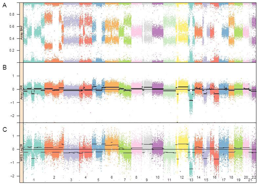 Allele frequencies (A) and log R ratios (B) estimated by GenomeStudio. Autosomal log R ratios were segmented by circular binary segmentation [11] as indicated in black; (C) Log R values from whole exome sequencing were obtained by the EXCAVATOR program [12] and aligned to panels A and B, providing a qualitatively similar profile of the copy number alterations. Black lines depict the segmentation of the log R values.