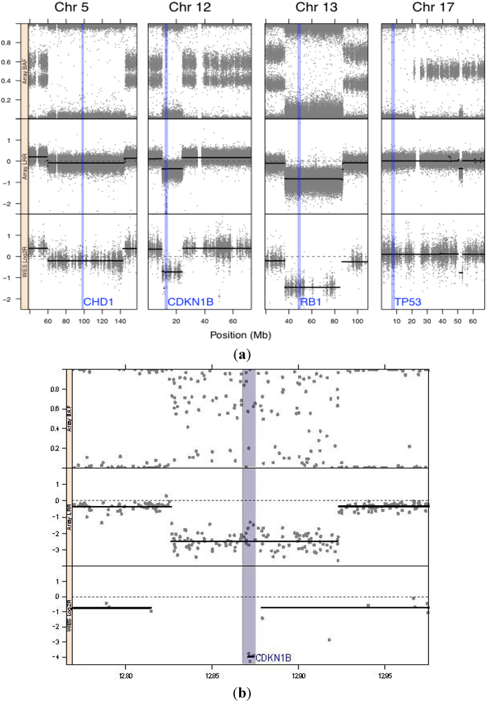 The location of the key genes described in the text. CHD1 (Chr 5: 98.190–98.265 Mb) was not mutated but occurs in a block of LOH; CDKN1B (Chr 12: 12.870–12.875 Mb) has low copy number, RB1 (Chr 13: 48.878 Mb–49.056 Mb) occurs in a block of LOH, has reduced copy number and the retained allele is predicted to be damaging; TP53 (Chr 17: 75.712 Mb–75.909 Mb) occurs in a copy neutral block of LOH and the retained allele is predicted to be damaged. Figure 2b, magnified view of the CDKN1B region showing a likely deletion of the gene supported by both the array (top and middle panels) and exome-sequencing platforms (bottom).