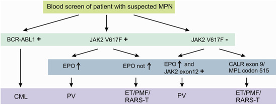 - Tefferi, A.; Skoda, R.; Vardiman, J.W. Myeloproliferative neoplasms: Contemporary diagnosis using histology and genetics. Nat. Rev. Clin. Oncol. 2009, 6, 627–637. [Google Scholar] [CrossRef]