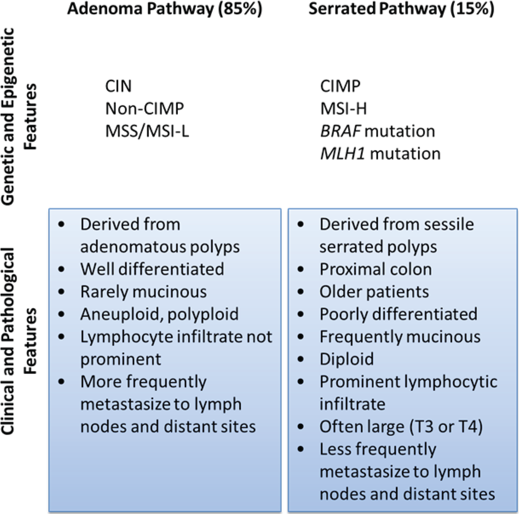Classification of CRC by pathogenic pathway. The classical pathway involves a progressive accumulation of mutations due to chromosomal instability as an adenoma develops into adenocarcinoma. Serrated polyps, which are thought to develop from hyperplastic polyps, are generated due to microsatellite instability and/or high levels of CpG island methylation. The adenocarcinomas that emerge from that pathway have distinct clinical and pathological features.