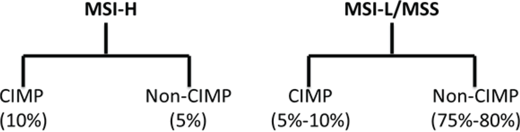 Tumors with a high degree of MSI (MSI-H; about 15% of CRC) are characterized by frequent microsatellite length mutations. MSI occurs due to deficiencies in the mismatch repair (MMR) system, which recognizes and repairs nucleotide mismatches. Most sporadic MSI-H CRCs are caused by hypermethylation (epigenetic silencing) of the mismatch-repair gene MLH1. This silencing typically occurs in tumors of the CIMP phenotype. There is substantial overlap between MSI-H cancers and cancers containing a high degree of CIMP (Figure 2).