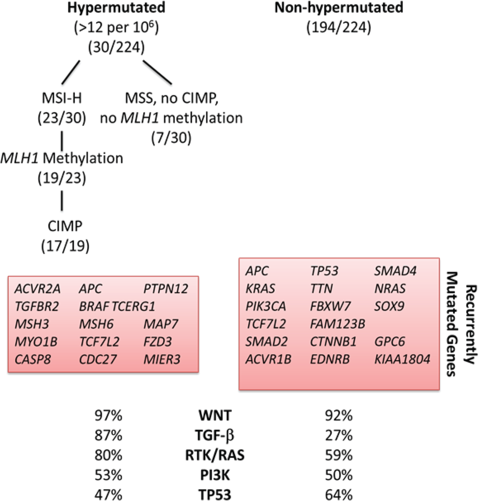 Most investigators classify sporadic CRC according to molecular pathway leading to its pathogenesis (Figure 1): chromosomal instability (CIN), microsatellite instability (MSI) and CpG island methylator phenotype (CIMP). Others have proposed a molecular classification system in which groups of CRC are defined according only to MSI and CIMP status in conjunction with clinicopathological features (Figure 2) [10,11]. More recently, based on data generated from The Cancer Genome Atlas Project, CRC has been designated as hypermutated or non-hypermutated, based on mutation rates (Figure 3).