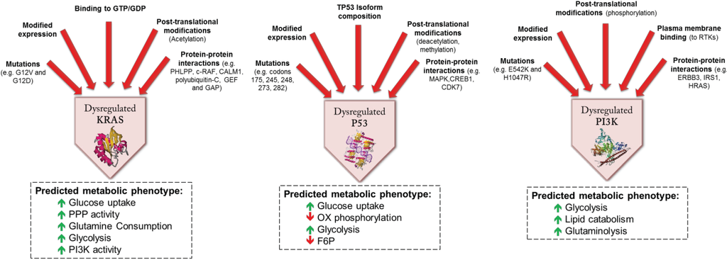 | KRAS | GTPase kras | Activating mutation | Increased glucose uptake. Increased glycolysis, activation of PI3K pathway |