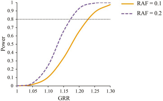 Power analyses showed that for gene sets containing on average SNPs with a risk allele frequency (RAF) of at least 0.1, our sample had sufficient power (≥0.80) to detect gene sets with a genotype relative risk (GRR) of 1.23 (Figure 1). For gene sets containing a mean RAF of at least 0.2, we had sufficient power to detect gene sets with a GRR of 1.17.