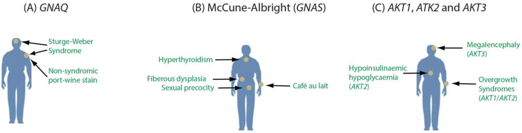 Tissue-specific effects of mutations in GNAQ (A); GNAS (B); and AKT1, AKT2, and AKT3 (C). Constitutively activating mutations in GNAQ may lead to either Sturge-Weber syndrome, nonsyndromic port-wine stains, or uveal melanoma (A). Somatic activating mutations in GNAS lead to McCune-Albright syndrome, which may involve variable hyperthyroidism, café au lait macules and sexual precocity (B). Activating mutations in all three of the AKT genes cause cellular overgrowth phenotypes with mutations in AKT2 also implicated in abnormal insulin signaling (C).