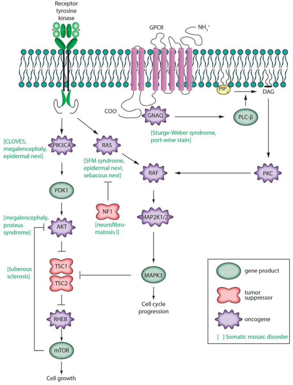 We have described a series of oncogenes and tumor suppressor genes that undergo somatic mutation in cancer. These same genes can also acquire somatic mutations that result in neurocutaneous disorders or overgrowth syndromes, depending the particular cell type and developmental stage at which the mutation occurs. Mutations in GNAQ cause Sturge-Weber syndrome and port-wine stain birthmarks as well as uveal melanoma, as discussed above. Similarly, somatic mutations in GNAS can cause McCune-Albright syndrome or benign tumors such as adenomas. We next highlight several specific examples of such disorders affecting genes encoding intracellular signaling pathways (Figure 4).