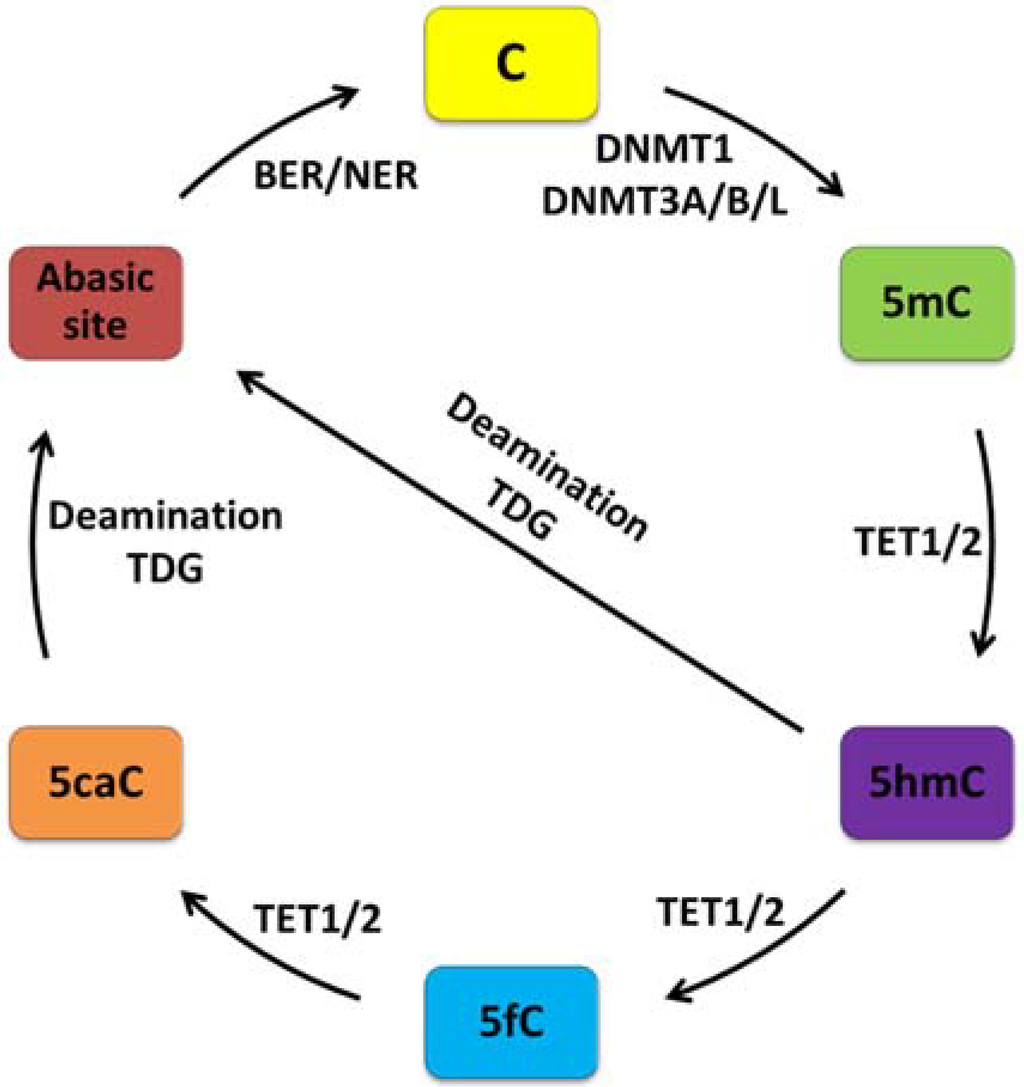 Moreover, oxidized cytosines can also be directly erased by the DNA repair machinery. The derivatives 5fC and 5caC are efficiently excised by TDG and repaired by the base excision (BER) pathway; a possibility that has been described so far only in embryonic stem cells (ESC) [32,35].