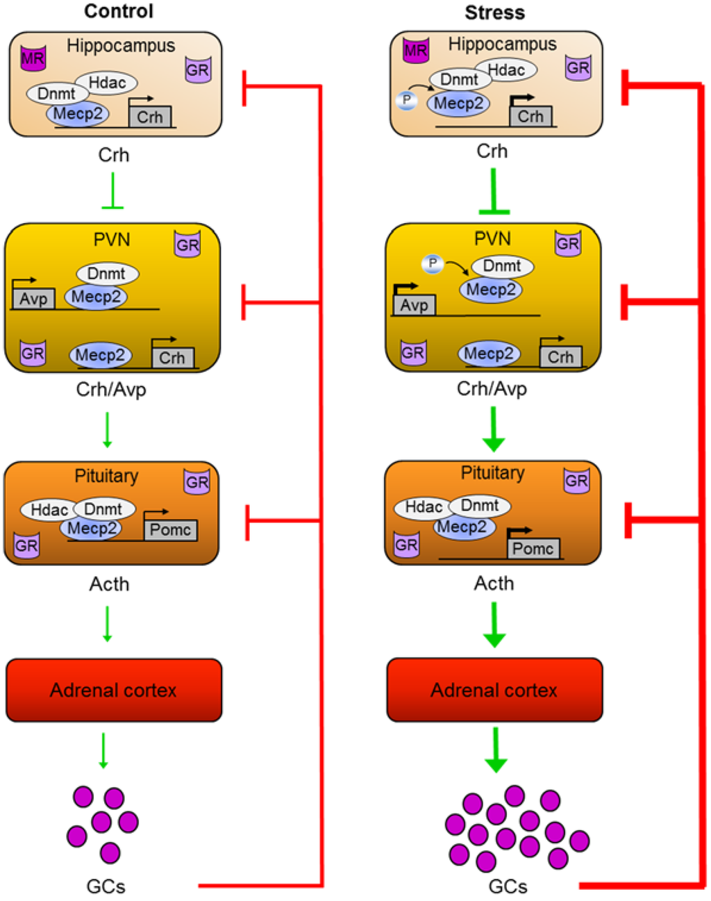 Roles of Mecp2 in epigenetic programming of the HPA axis by ELS. The two neuropeptides corticotrophin-releasing hormone (Crh) and arginine-vasopressin (Avp) are released in response to stress from the nucleus paraventricularis of the hypothalamus (PVN) and jointly stimulate in the anterior pituitary the production of pro-opiomelanocorticotrophin precursor mRNA (Pomc) and the secretion of its posttranslational product adrenocorticotrophin (Acth). Subsequently, Acth enhances the secretion of glucocorticoids (GCs) from the adrenals. These stress hormones bind to nuclear glucocorticoid and mineralocorticoid receptors (GR and MR), which are expressed at different levels of the HPA axis and serve to set back the stress response. In hippocampal CA3 Mecp2 binds under resting conditions to the Crh promoter and represses gene activity through recruitment of Dnmts and Hdacs. Upon ELS exposure, Mecp2 becomes phosphorylated at S421, dissociates, and relieves Crh repression. Mecp2 also binds to Crh in the PVN but stays unaffected by ELS. In contrast, Mecp2 occupancy at the downstream Avp enhancer responds to ELS by S421-phosphorylation and derepression of Avp. Due to its association with Dnmts, Mecp2 occupancy maintains enhancer methylation, while ELS-induced dissociation facilitates hypomethylation and gives rise to a lasting memory trace. Likewise, Mecp2 binds to the proximal Pomc promoter region in the anterior pituitary and interacts hereby with Dnmts and Hdacs to repress Pomc expression. In contradistinction to the PVN, ELS-induced Mecp2 dissociation is unrelated to S421-phoshorylation indicating tissue- and cell-type specificity of this modification. Loss of Mecp2 binding facilitates, however, Pomc hypomethylation and increased gene expression.
