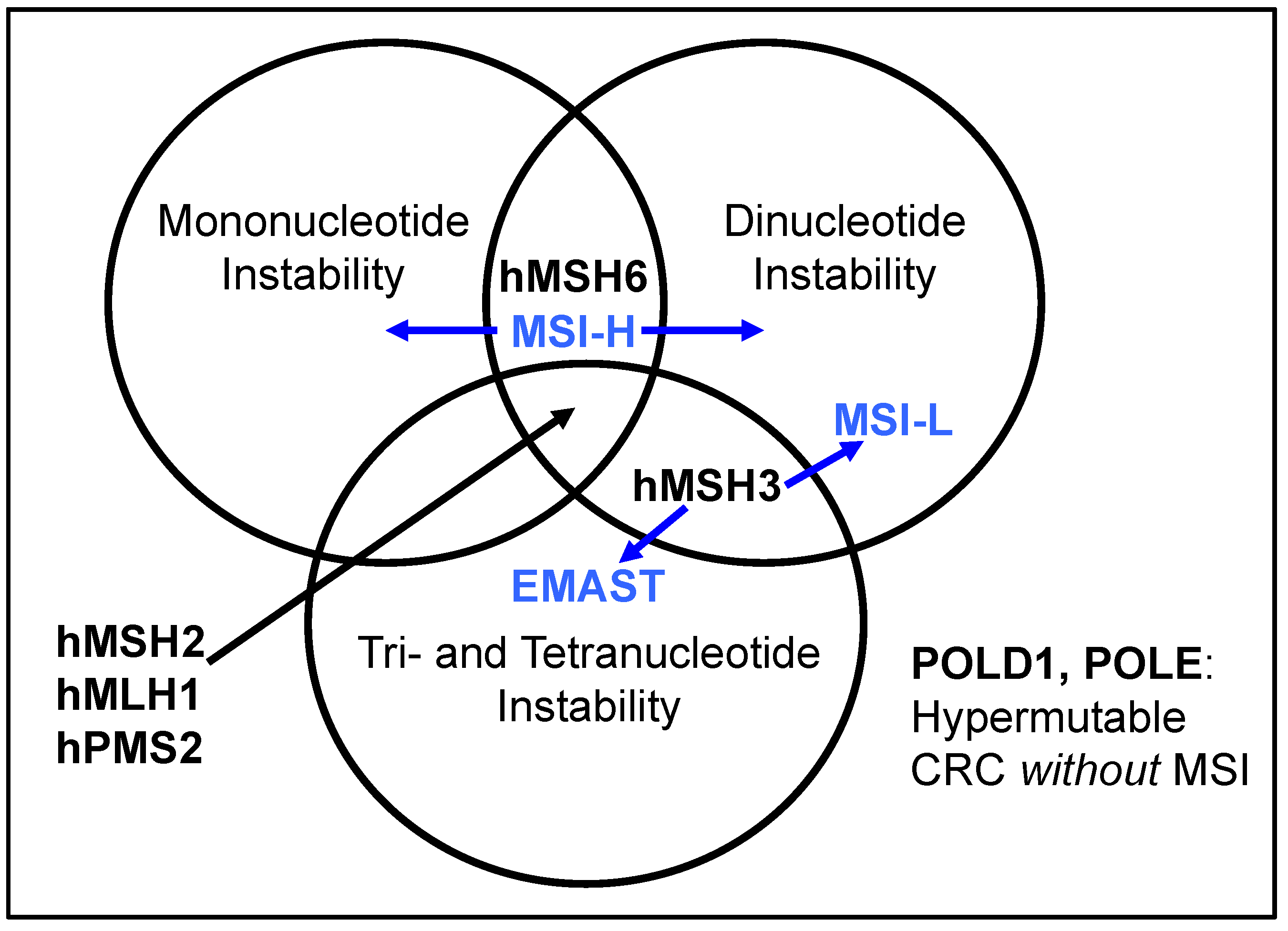 Spectrum of microsatellite frameshift mutations based on DNA mismatch repair protein function. Loss of function of MSH3 encompasses EMAST and MSI-L. Mutation of the DNA polymerases, POLD1 and POLE, are found in hypermutable tumors but do not demonstrate microsatellite instability.