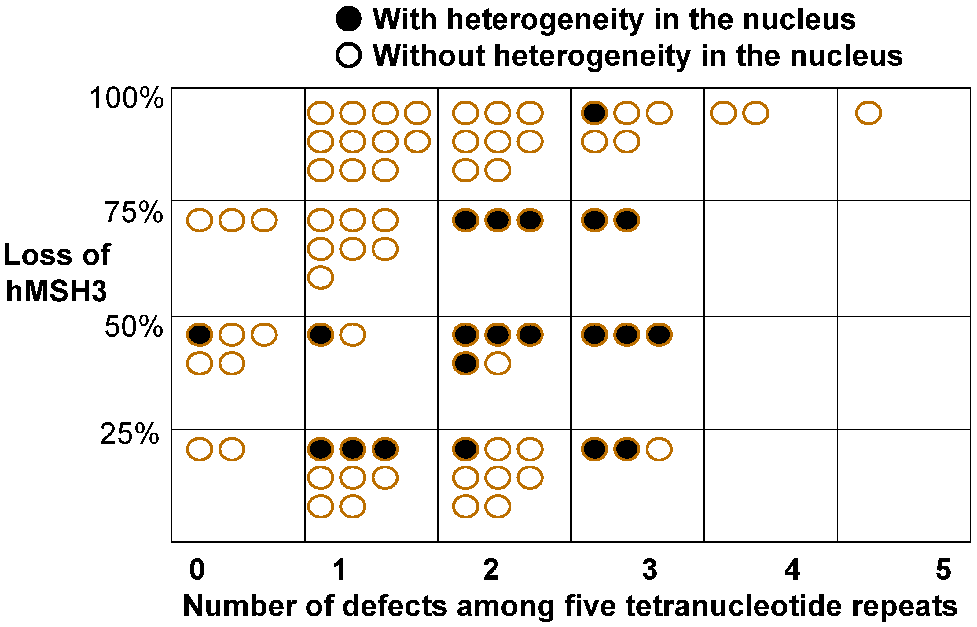 The degree of MSH3 protein loss matched with the number of tetranucleotide frameshift mutations. Filled-in circles represent colorectal cancers with nuclear expression heterogeneity, and open circles represents cancers without nuclear heterogeneity. From Lee S-Y, Chung H, Devaraj B, Iwaizumi M, Han HS, Hwang DY, Seong MK, Jung BH, Carethers JM. Elevated microsatellite alterations at selected tetranucleotide repeats are associated with morphologies of colorectal neoplasia [22].