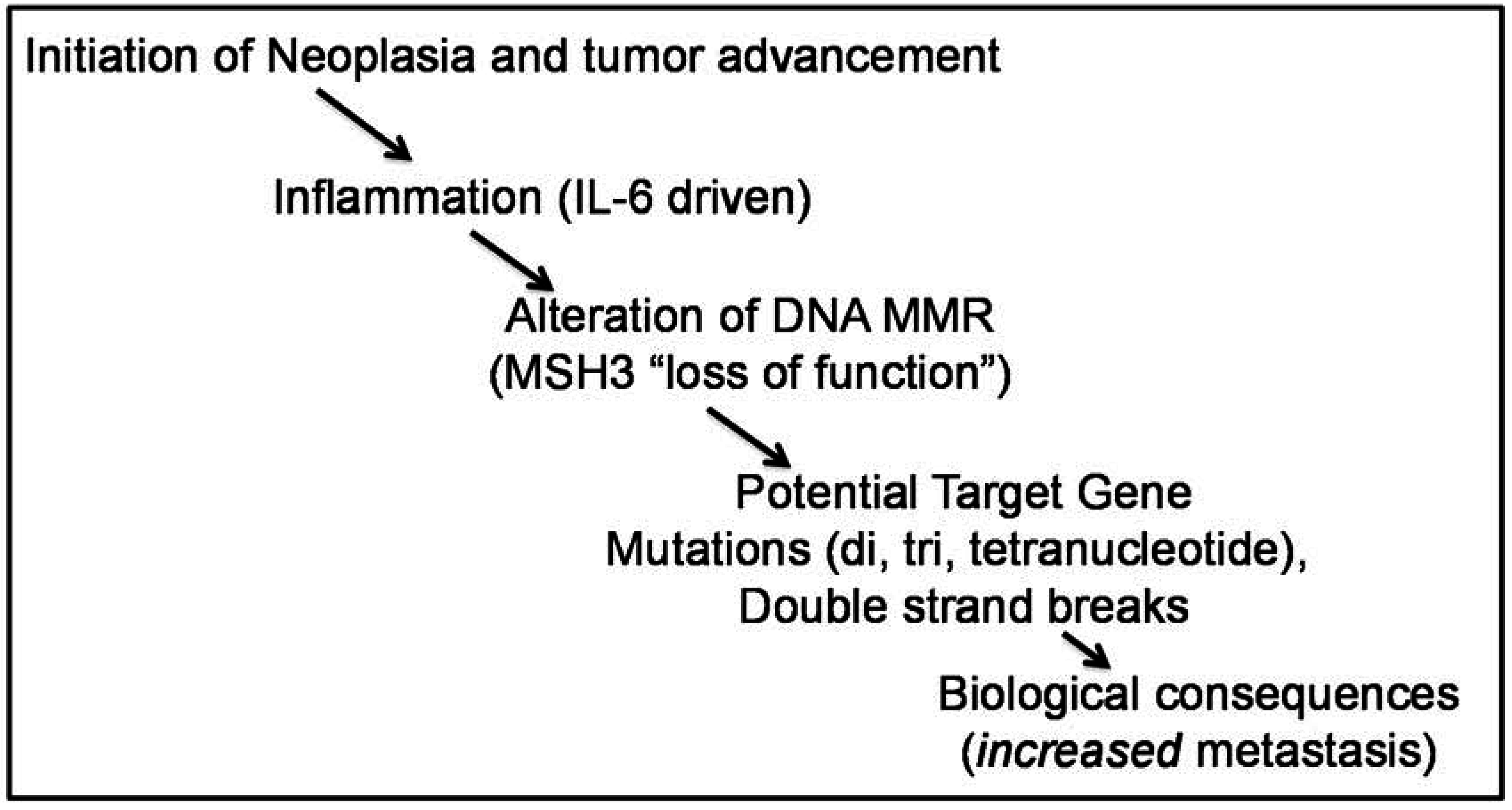 A model for modulation of the pathogenesis of colorectal cancer by EMAST. After the tumor has initiated, inflammation can modify the DNA repair function within the tumor through cytokine signaling, hypoxia, and oxidative stress. Evidence supports that Interleukin-6 can shift MSH3 protein from its nuclear locale to the cytosol, allowing accumulation of mutations and double strand breaks. It is believed that these genetic changes modify the tumor behavior, as patients with EMAST cancers present with advanced stage and are more likely to have metastasis.