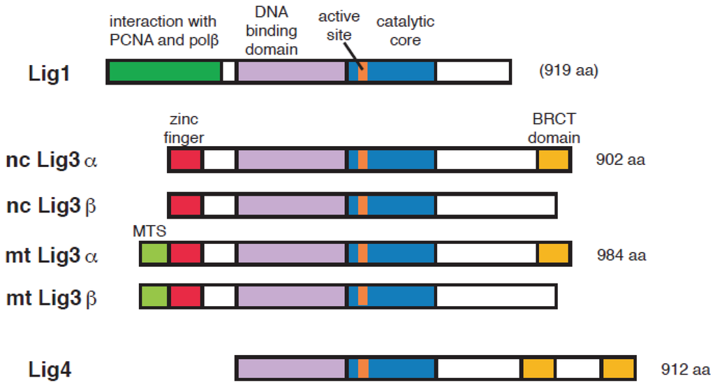 The Lig3 gene, from a single genetic locus, can generate four different proteins with DNA ligase activity []. While the majority of Lig3 mRNA is translated starting from the second ATG codon on the mRNA, about 10% of translation-initiation events use the first ATG codon, that adds ~80 amino acids to the polypeptide. This endows the resulting protein with a mitochondria target sequence (MTS) that allows its transport into this DNA containing organelle, in order to cover all its DNA ligation needs [,] (Figure 1). Notably, in S. cerevisiae, this function is served by the mitochondrial form of a polypeptide encoded by the Lig1 gene. Thus, the mitochondrial DNA ligation function has been transferred from Lig1 to Lig3 during evolution from yeast to vertebrates.